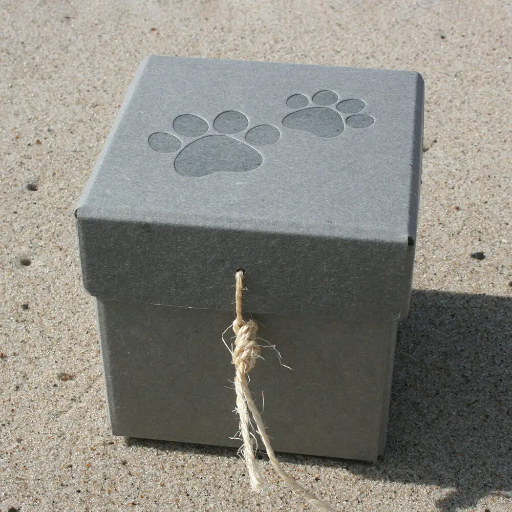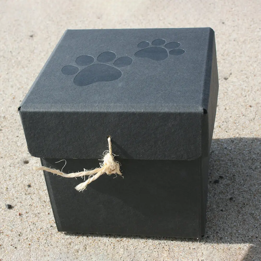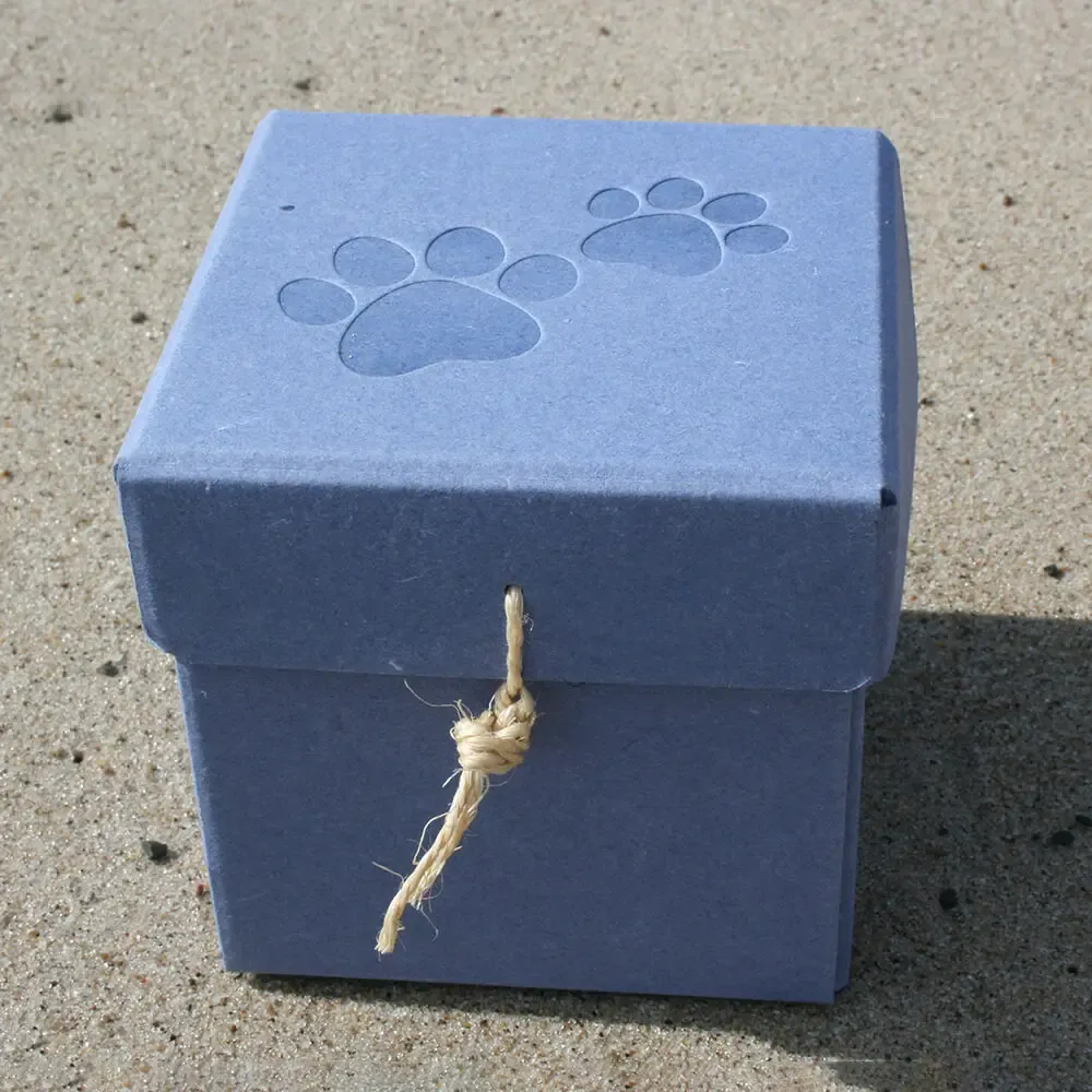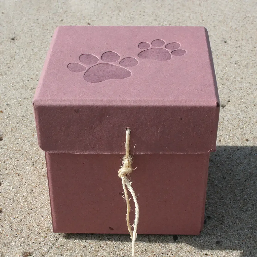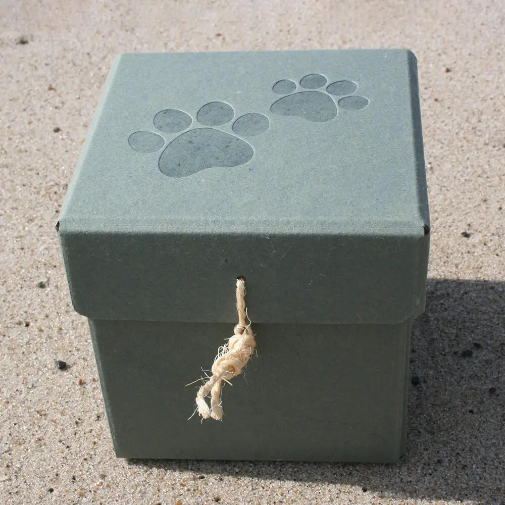 Pappet laves af genbrugspapir og åvand. Hele processen laves i hånden og ved hjælp af gamle maskiner. Og limen til at holde siderne sammen er vandbaseret og opløselig. Garnet der bruges til urnen er også 100% naturligt. Der medfølger et manillamærke og et hjerte lavet af pap, hvor du har mulighed for at skrive dyrets navn.